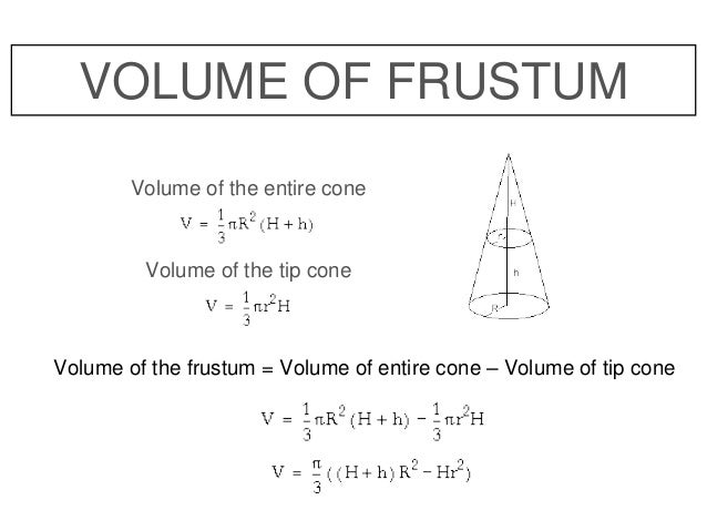 Then we can write the volume as the integral: Systematic studies with engineering applications for beginners. Volume of frustum (the same formula applies to both the frustum of a pyramid and the frustum of a cone) v = (h / 3) * a 1 + a 2 + √ (a 1 * a 2 ) v = v frustum = volume of frustum in meters 3. How to use the calculator. For the height we can derive it from the slant height.
